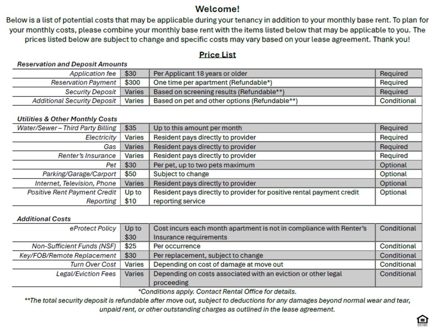 Price shown is Base Rent. Residents are required to pay the following: Application Fee ($30.00 Per Applicant 18 years or older, One-Time, At Application), Reservation Payment ($300, One time per apartment, Refundable*), Security Deposit (Varies, Based on screening results, Per Apartment, Refundable**), Additional Security Deposit (Varies, Based on pet and other options, Refundable**, Water/Sewer (Up to $55 per month per apartment, Utility, Usage Based, Nonrefundable), Recycling ($2 per month per apartment, if applicable, Nonrefundable), Electricity/Gas (Varies, Usage Based, Utility, Resident pays directly to provider), Renter’s Insurance (Varies, Resident pays directly to provider). Optional charges that may be applicable to the resident are as follows: Pet ($30 Per pet per month, Up to two pets maximum, Nonrefundable), Parking/Carport/Garage/Storage (Varies per property, per month, Subject to change, Nonrefundable, Refundable** deposit may apply), Internet, TV, Phone (Varies, Utility, Resident pays directly to provider), eProtect Policy (Up to $30, Cost incurs each month apartment is not in compliance with Renter’s Insurance requirements, Nonrefundable), Non-Sufficient Funds (NSF) ($25 Per occurrence, Nonrefundable) Key/FOB/Remote Replacement (Varies per property, Per replacement, Subject to change, Nonrefundable), Positive Rental Payment Credit Reporting ($2.00 per month per resident, Resident pays directly to CredHub, Nonrefundable), Turn Over Cost (Varies, Depending on cost of damage at move out), Legal/Eviction Fees (Varies, Depending on costs associated with an eviction or other legal proceeding). *Conditions apply. Contact Rental Office for details. **The total security deposit is refundable after move out, subject to deductions for any damages beyond normal wear and tear, unpaid rent, or other outstanding charges as outlined in the lease agreement.